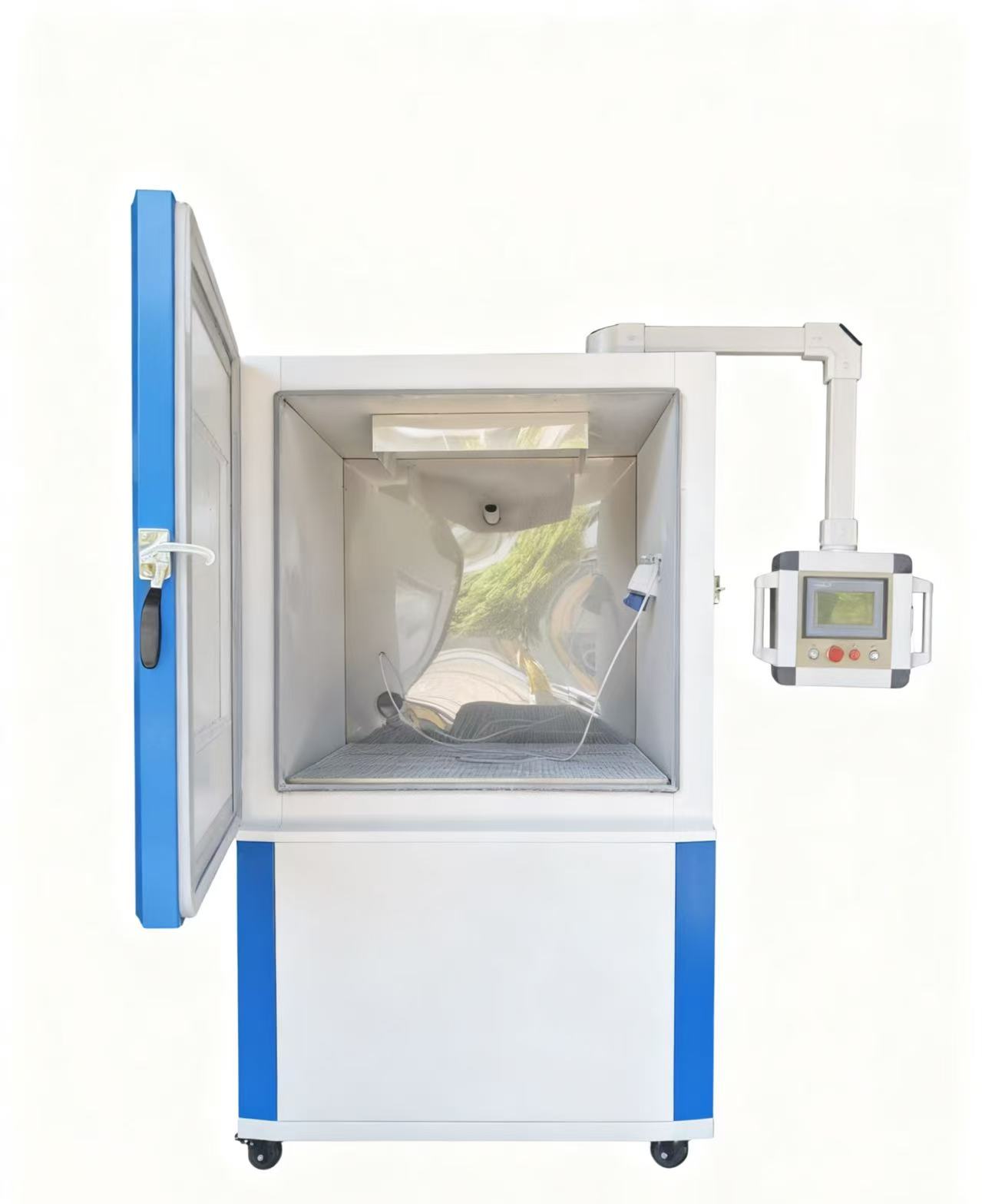 由风机推动一定浓度的沙尘以一定的流速吹过试验样品表面,测试这些试验样暴露于干砂或充满尘土的大气作用下防